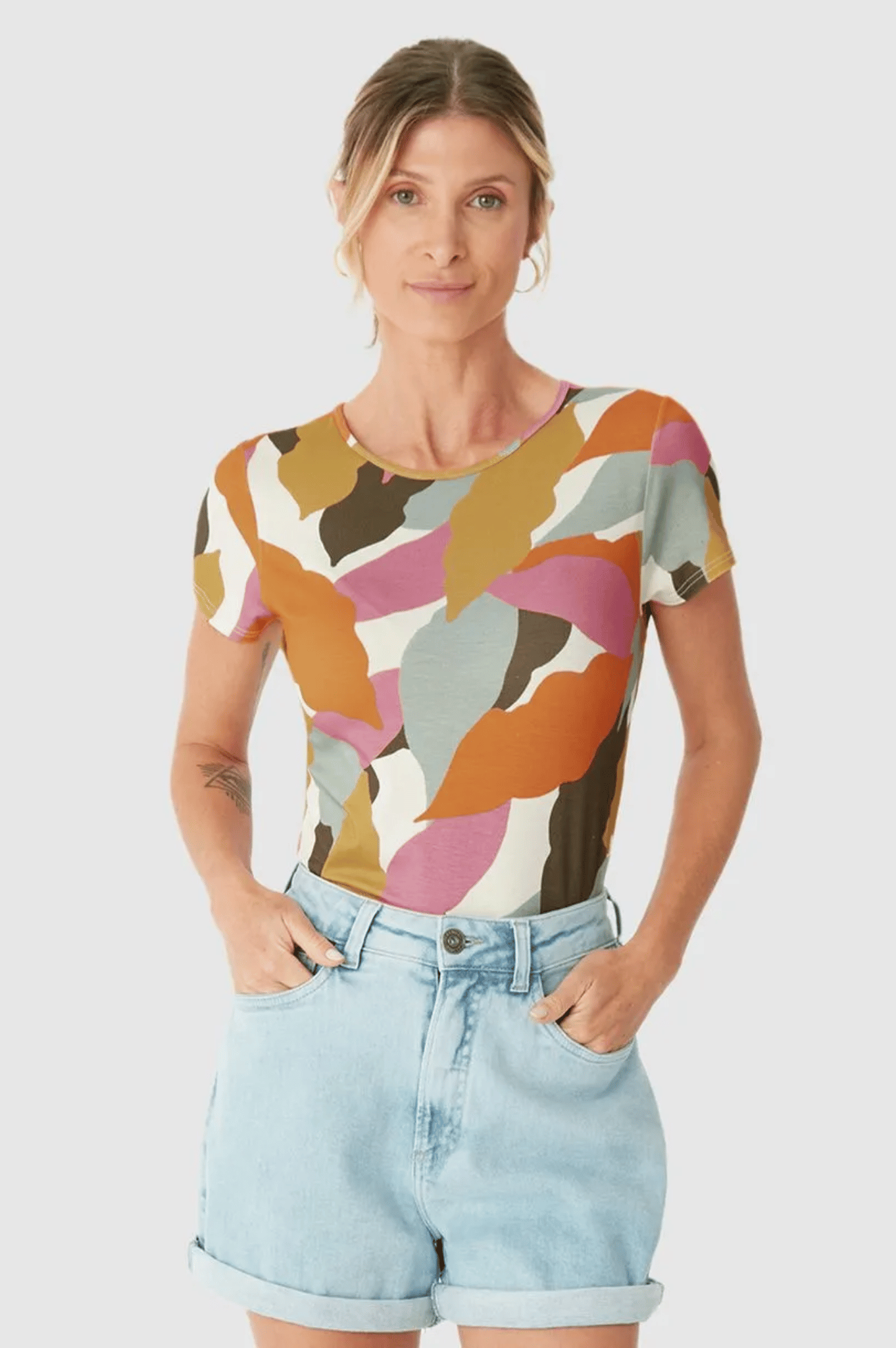 A blusa apresenta modelagem justa ao corpo, que valoriza a silhueta, e possui decote redondo e manga curta. O diferencial está nas estampas modernas e exclusivas, aplicadas digitalmente, que adicionam personalidade à peça. É uma blusa versátil, perfeita para ser combinada com calças, shorts ou saias.