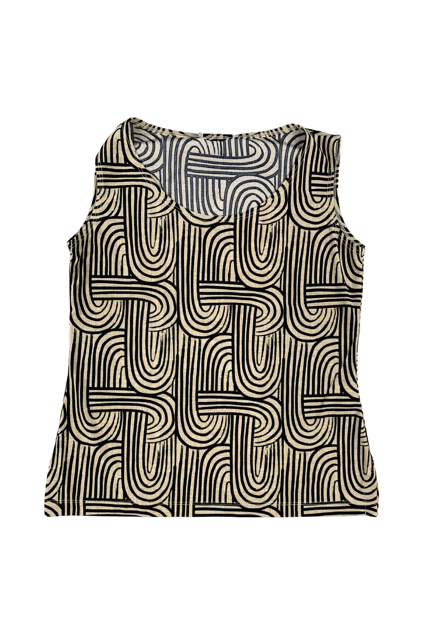 Com modelagem clássica (regata) e decote U, o destaque fica por conta da estampa exclusiva de grafismo abstrato em tons de bege, preto e branco. A repetição de formas orgânicas e traços fortes confere um visual contemporâneo e sofisticado, que valoriza a peça. É perfeita para ser usada em looks casuais, de trabalho ou até mesmo em ocasiões que pedem um toque de arte e estilo.