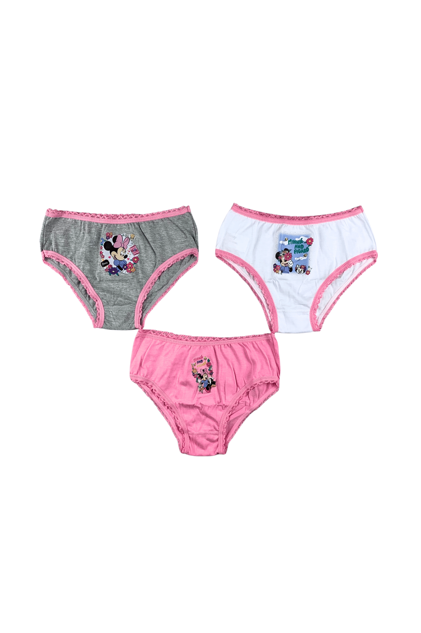 O kit contém 3 calcinhas em cores sortidas, todas com estampa delicada da adorada personagem Minnie Mouse, proporcionando charme e diversão. Seu formato anatômico e o ajuste perfeito asseguram maior conforto, adaptando-se ao corpo da criança com praticidade.