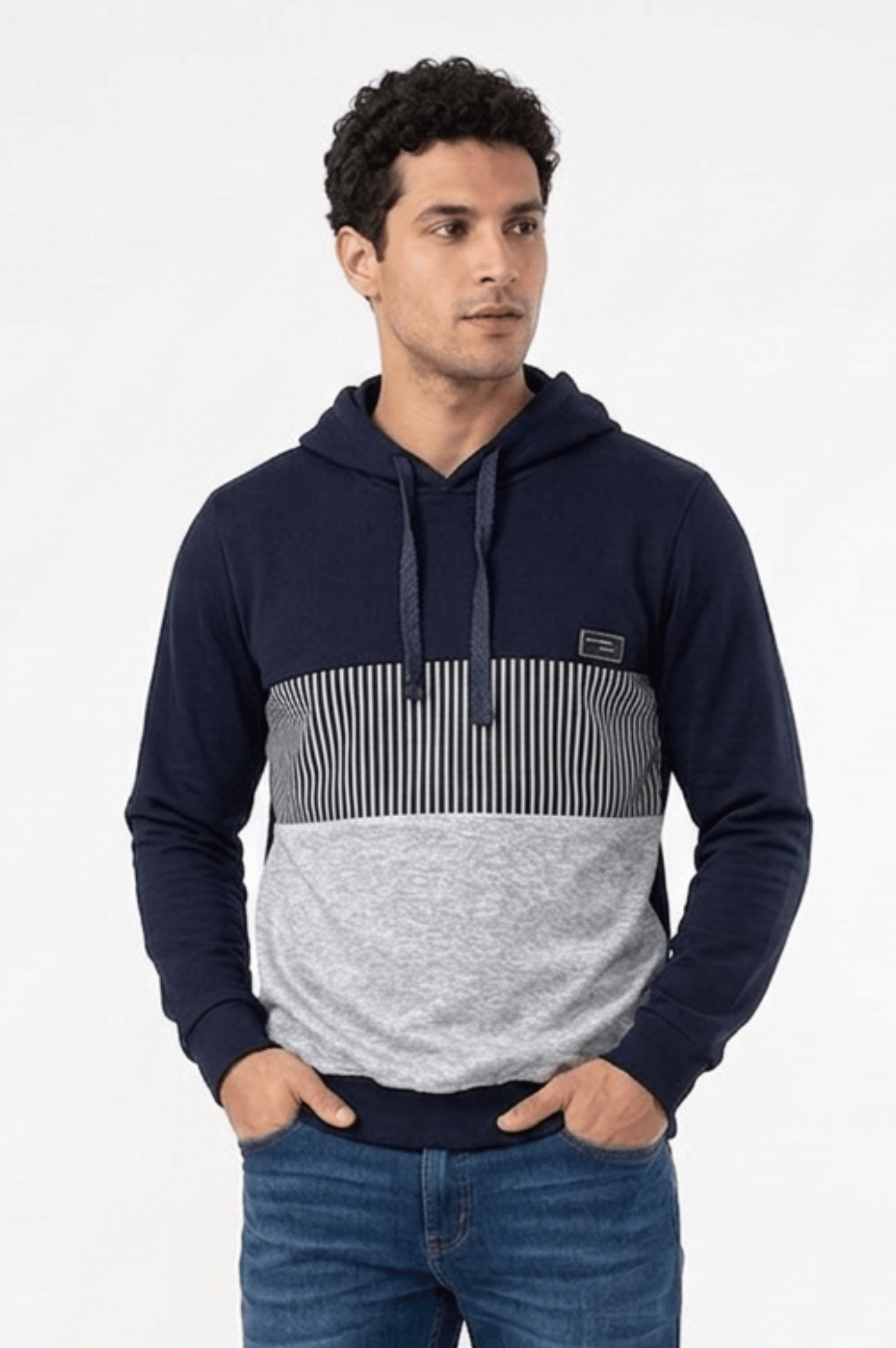 - Estampa: O casaco apresenta uma combinação elegante de cores e padrões. A parte superior é lisa e na cor marinho, enquanto a região do abdômen é listrada, alternando entre marinho e cinza. A parte inferior do casaco é totalmente cinza, e as costas são lisas e na cor marinho, criando um visual moderno e versátil.