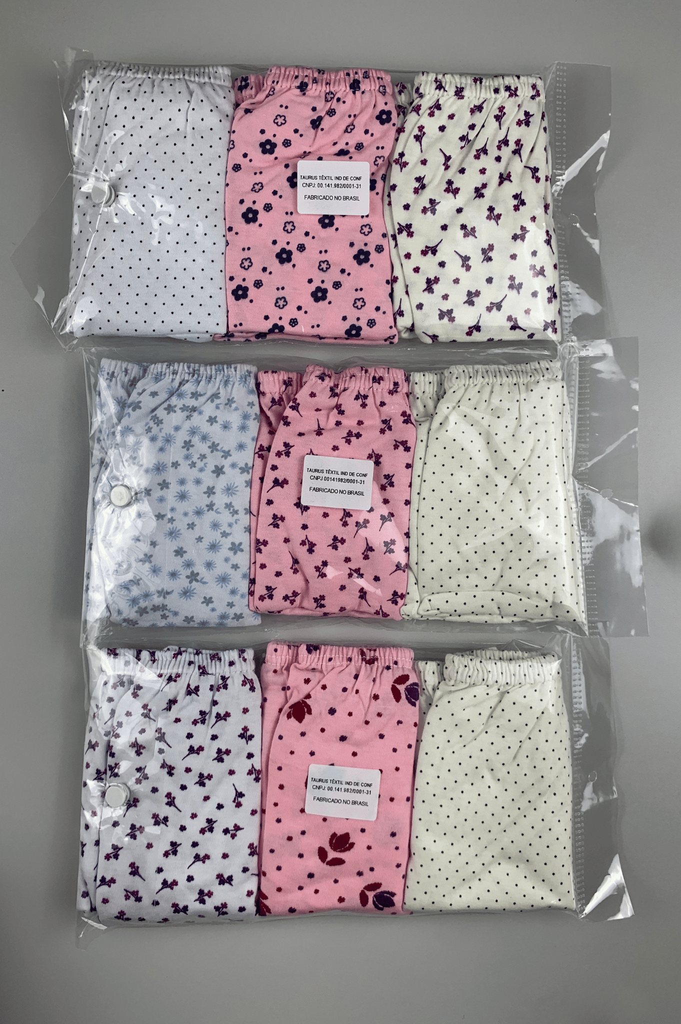 O kit é composto por três calçolas com modelagem tradicional de cintura alta ou média e laterais largas (calçola), oferecendo máxima cobertura e sustentação para o uso diário. As peças apresentam estampas sortidas e delicadas que adicionam um toque feminino e divertido. Este kit é um item essencial, proporcionando o bem-estar e o ajuste perfeito que você procura em roupas íntimas.