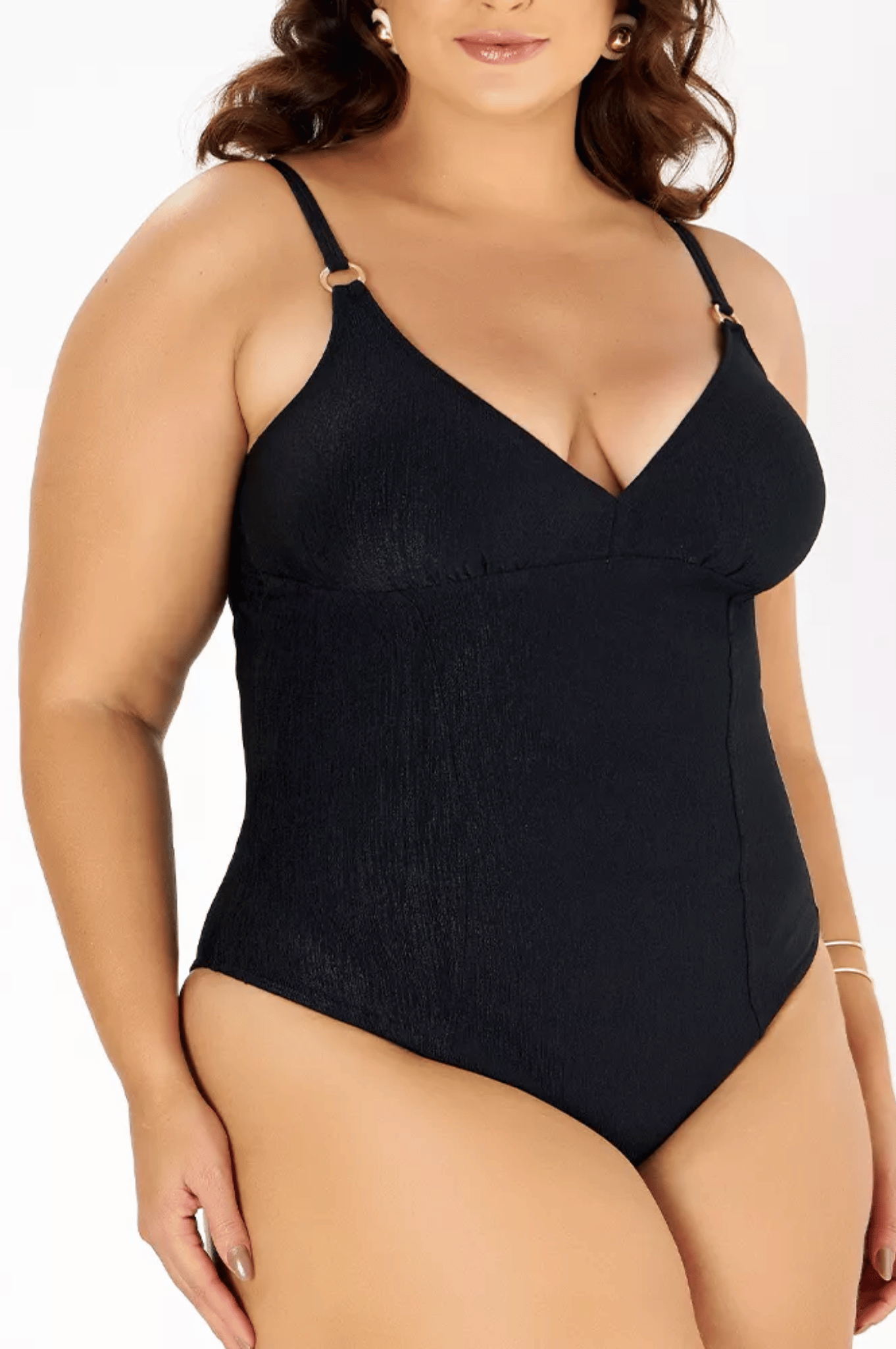 O modelo ainda conta com bojos removíveis, inseridos em bolsos internos de lycra com franzido na base, que proporcionam melhor encaixe e sustentação natural. Como toque final de elegância, as argolas douradas com acabamento antioxidante trazem sofisticação e resistência ao contato com água e produtos químicos.