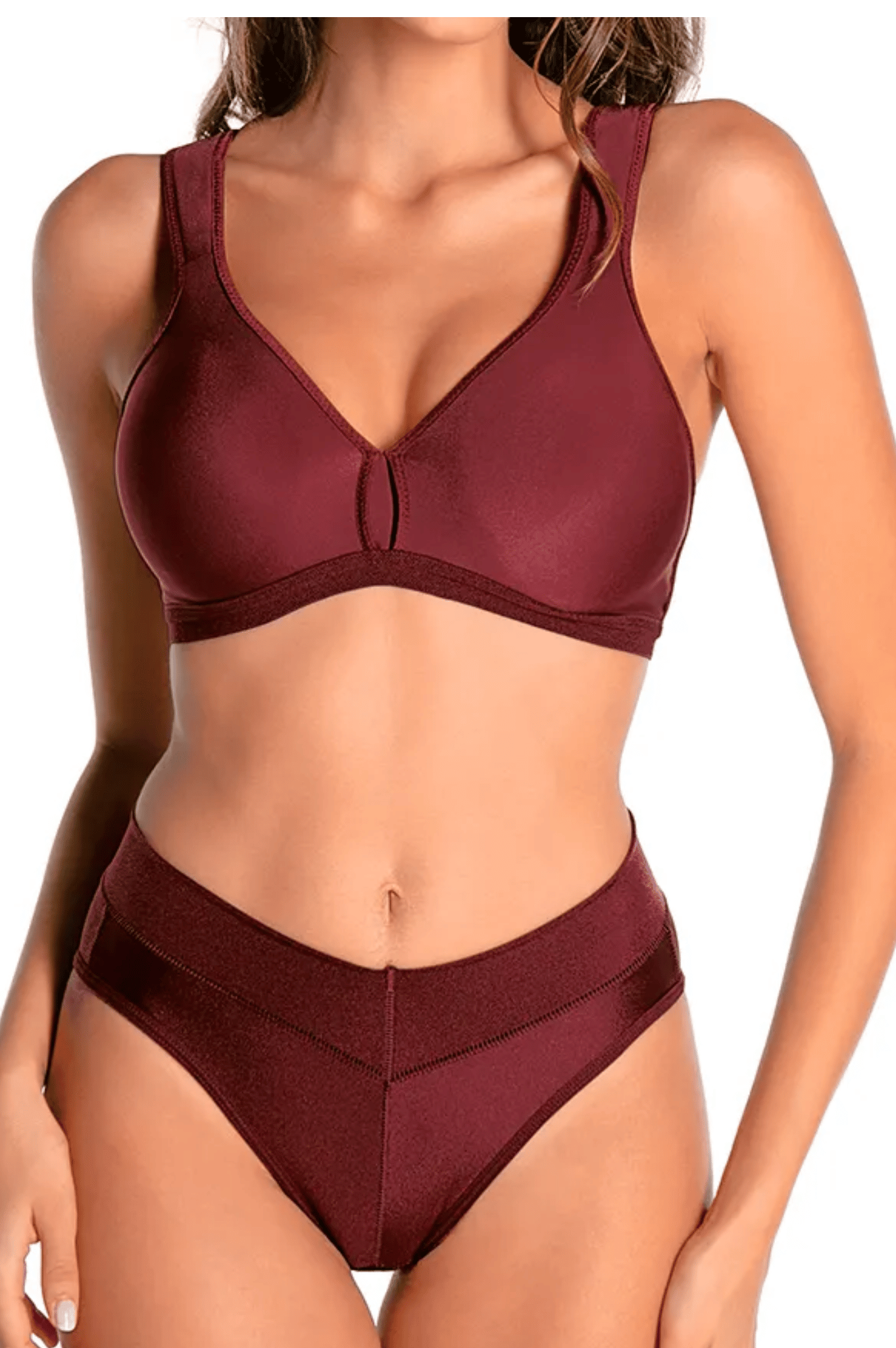 Seu design conta com taças duplas, sem espuma e sem aro, garantindo uma modelagem natural dos seios com total liberdade de movimentos. O busto anatômico acomoda os seios na medida ideal, proporcionando segurança e bem-estar ao longo do dia.
