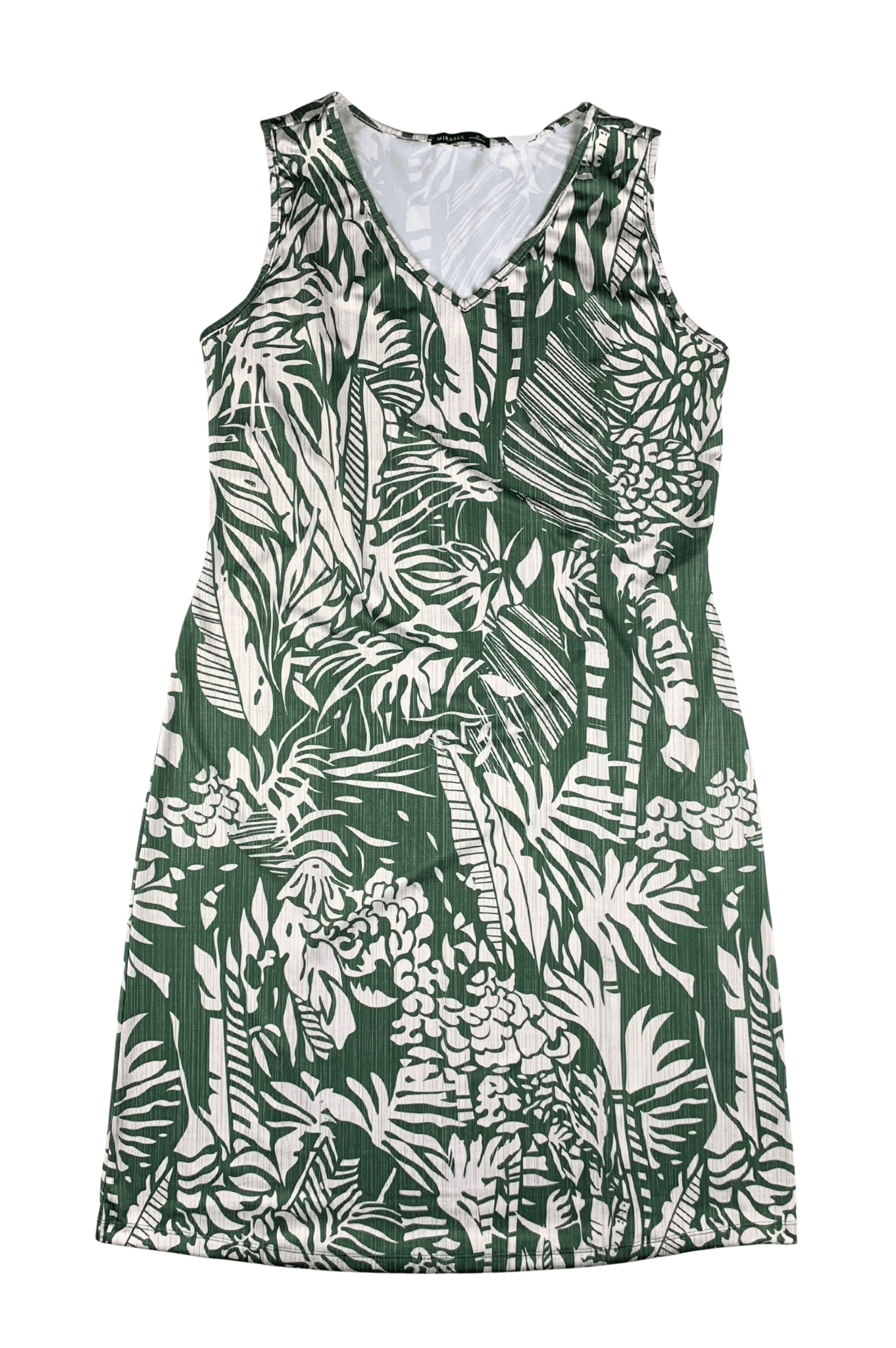 Com modelagem midi, o vestido apresenta uma estampa diferenciada (a estampa pode ser de folhagens, formas abstratas ou tropical, conforme a imagem, com predominância de tons de verde e branco). O design é sem mangas, com decote em V na frente, e o tecido possui uma textura sutil (como micro listras ou canelado fino) que confere um toque sofisticado à estampa. É uma peça versátil, perfeita para passeios, encontros casuais ou para adicionar cor e estilo ao seu guarda-roupa.