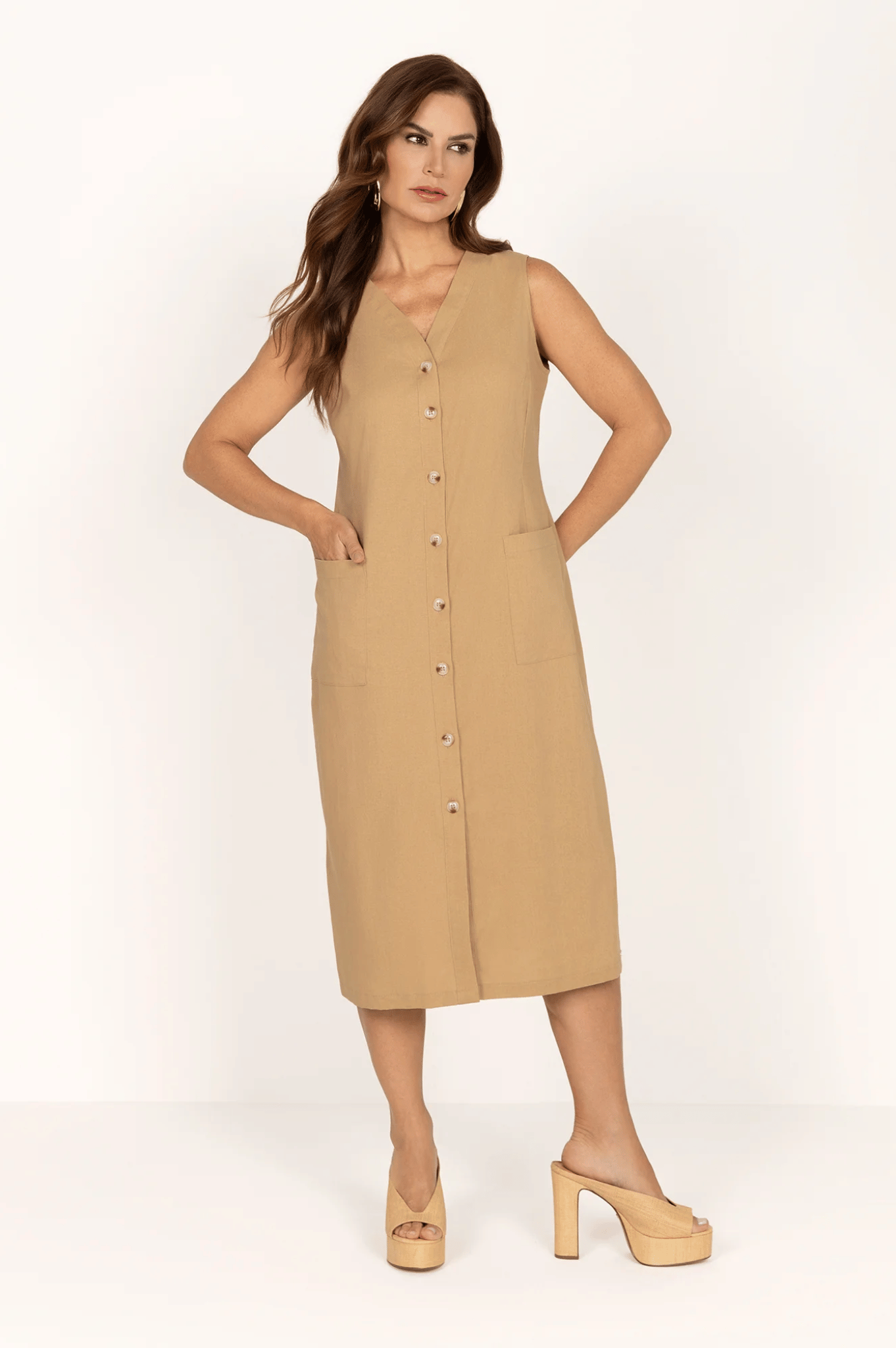 Com decote em V e modelagem regata, o vestido realça o colo e os ombros de forma delicada. Seu comprimento mídi proporciona sofisticação, enquanto o design solto ao corpo traz leveza e fluidez ao visual. Os botões frontais funcionais completam a peça com um toque moderno e versátil, permitindo diferentes combinações e ocasiões de uso.