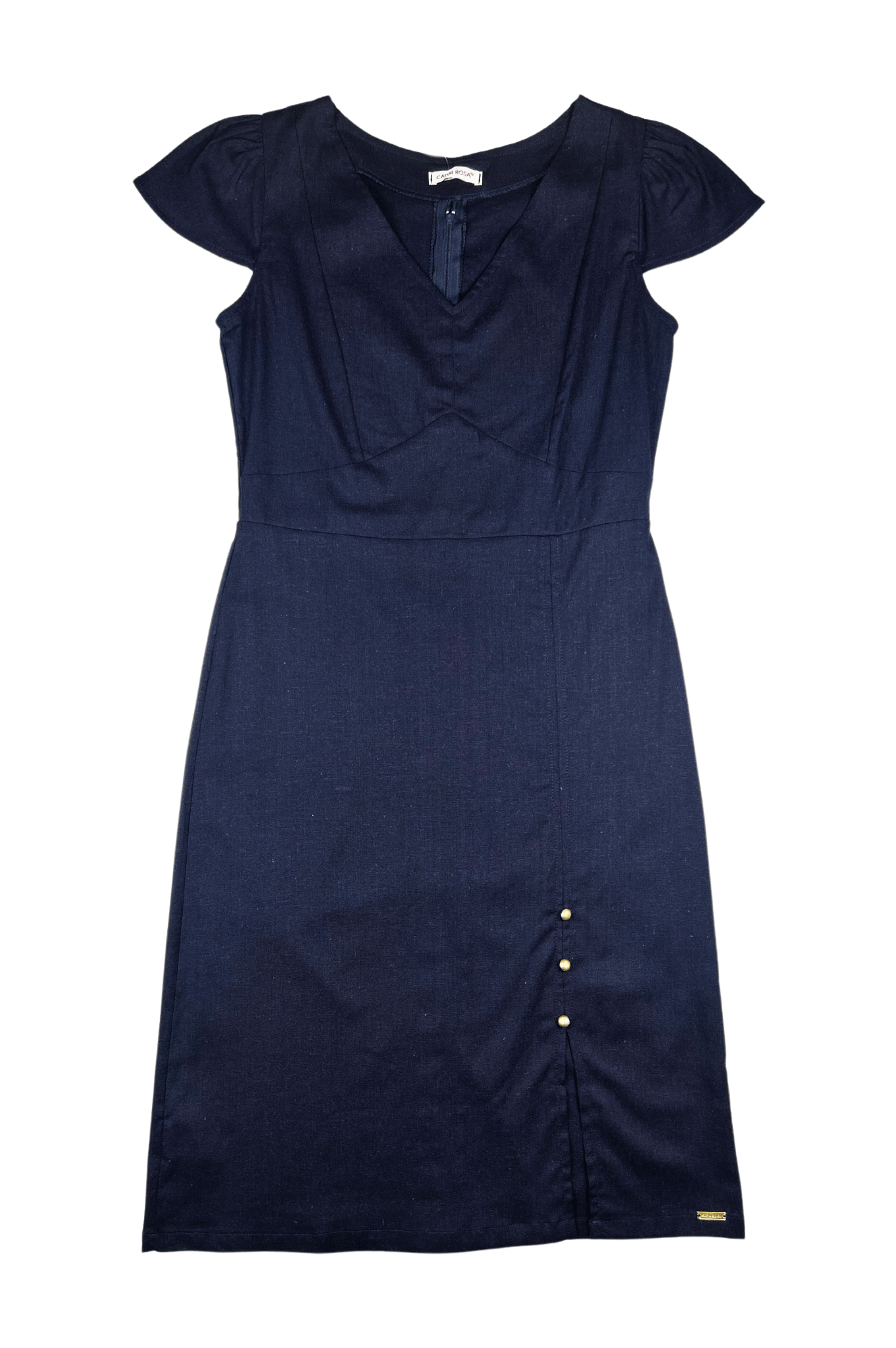 O Vestido Marinho Capim Rosa é confeccionado em de viscose, linho e elastano, ele oferece toque suave e leve, perfeito para os dias mais quentes. A manga ondulada e o detalhe de três pérolas na parte inferior adicionam um toque de delicadeza e sofisticação. O design moderno, com um rasgo que funciona como um detalhe discreto que confere movimento à peça, com a etiqueta dourada, garantem um visual único e elegante.